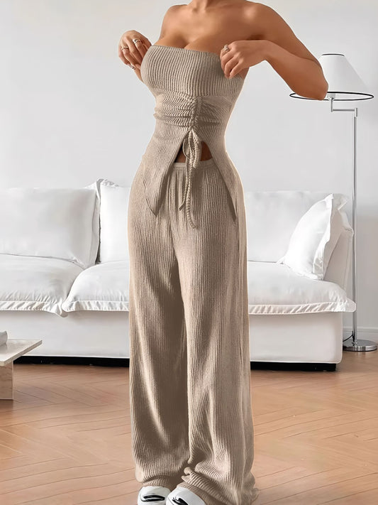 Ribbed Knit Tube Top and Wide Leg Pants Set