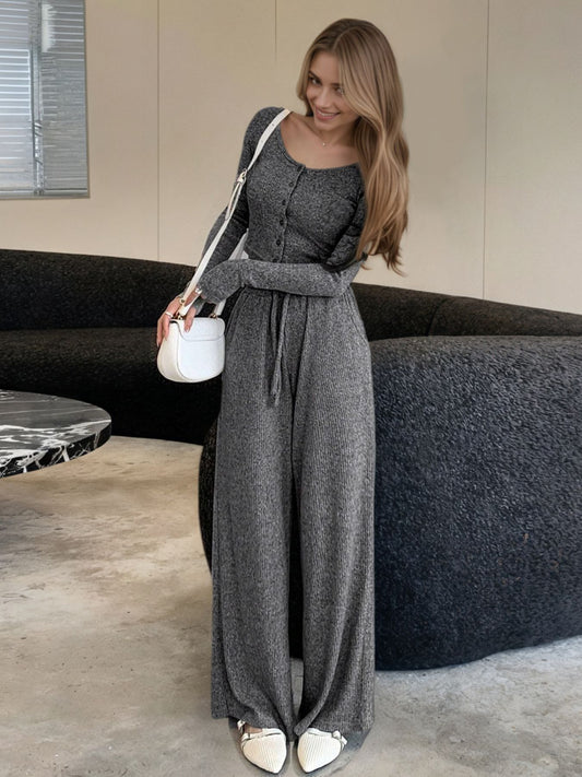 Casual Knit Long Sleeve Top and Wide Leg Pants Set